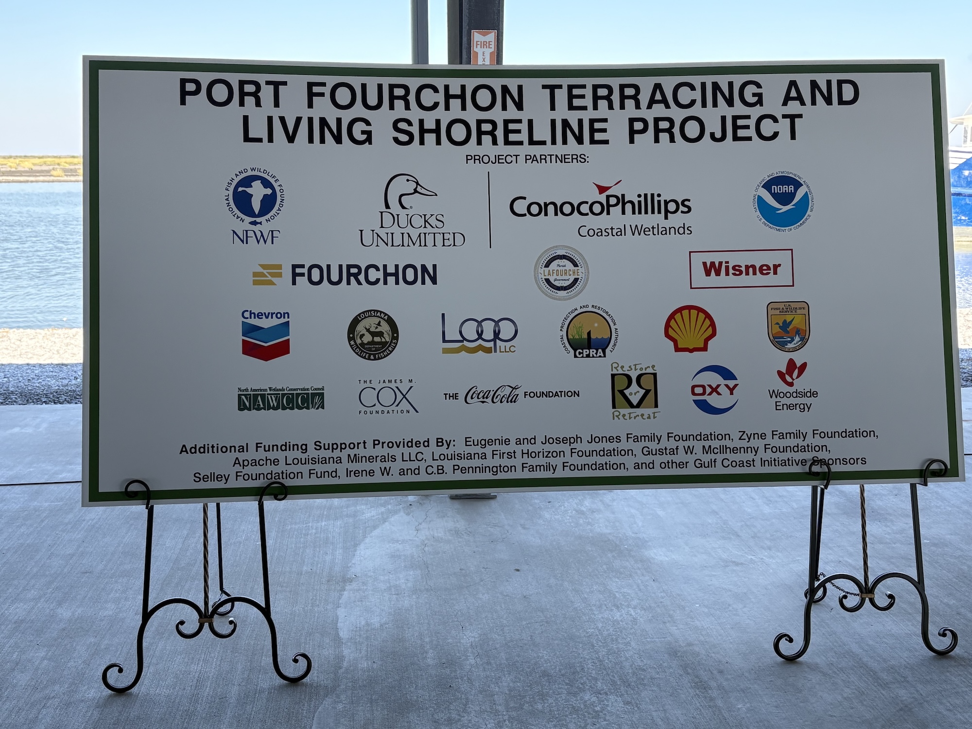 The Port Fourchon Terracing and Living Shoreline Project represents one of the broadest coastal restoration coalitions ever assembled. Phase I was made possible by the Edward Wisner Donation, Ducks Unlimited, National Fish and Wildlife Foundation, ConocoPhillips, Lafourche Parish Government, Greater Lafourche Port Commission, Chevron, James M. Cox Foundation, Louisiana Coastal Protection and Restoration Authority, Restore or Retreat, LOOP, North American Wetlands Conservation Council, Coca-Cola Foundation, Woodside Energy, Louisiana Department of Wildlife and Fisheries, Shell, U.S. Fish and Wildlife Service, Oxy, and the National Oceanic and Atmospheric Administration.